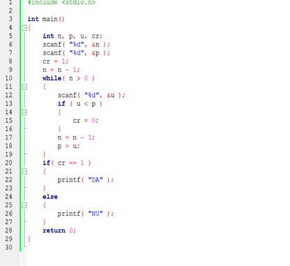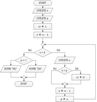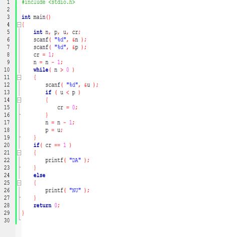 Algoritmul care verificã dacã un șir de n numere este ordonat crescãtor are în pseudocod forma de mai jos, iar în C cea din imaginea alãturatã: