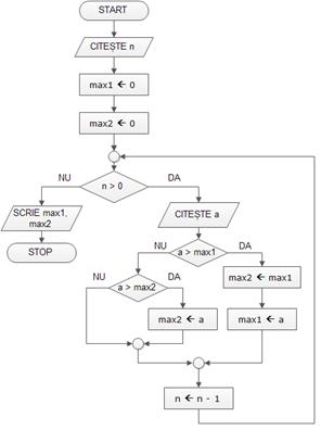 Algoritmul folosește variabilele max1, pentru a reține cea mai mare valoare din șir și max2 pentru a doua cea mai mare valoare;